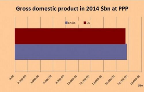 如今,正式結(jié)論已經(jīng)出爐。如圖所示,據(jù)國際貨幣基金組織(IMF)估計,2014年美國經(jīng)濟規(guī)模是17.4萬億美元,而中國的經(jīng)濟規(guī)模則是17.6萬億美元。