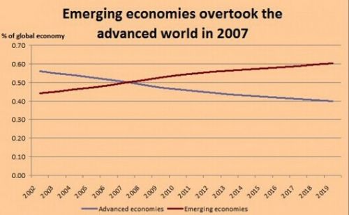 從更大的范圍說,中國現(xiàn)象是新興市場產(chǎn)出相對發(fā)達國家生產(chǎn)增長的一部分。2007年,新興市場的產(chǎn)出超過了全球總產(chǎn)值的一半,并且還在繼續(xù)增長。如今,盡管IMF對新興市場2011年以來的增長感到失望,新興市場占全球產(chǎn)值的比例已經(jīng)達到57%。