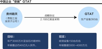 2011年4月底,貴陽(yáng)市工業(yè)投資(集團(tuán))有限公司(下稱“貴陽(yáng)工投”)與GTAT在貴陽(yáng)簽署藍(lán)寶石生產(chǎn)戰(zhàn)略合作協(xié)議。按照協(xié)議,貴陽(yáng)工投全資子公司貴州皓天光電科技有限公司投資2.188億美金采購(gòu)GT藍(lán)寶石生產(chǎn)設(shè)備360臺(tái),并將用兩年形成一期年產(chǎn)3000萬(wàn)片藍(lán)寶石襯底材料項(xiàng)目,屆時(shí)年銷售將達(dá)約40億元人民幣。