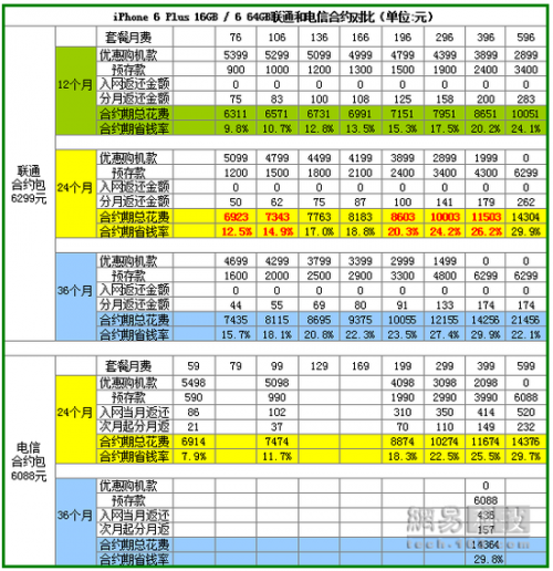 由于蘋果對于iPhone 6/6 Plus價格總體上分為四檔,即5288元的iPhone 6 16G版;6088元的iPhone 6 64G和6 Plus 16G版;6888元的iPhone 6 128G和6 Plus 64G版;7688元的iPhone 6 Plus 128G版四檔。因此,三大運營商在指定合約計劃的時候也會受此影響。截止目前,聯(lián)通公布了全部四檔的合約套餐,但是電信僅僅公布了前兩檔。因此,此次比較的數(shù)據(jù)為限于前兩檔價格版本,但是可以大體看出聯(lián)通和電信在合約套餐上的差異和優(yōu)惠程度。