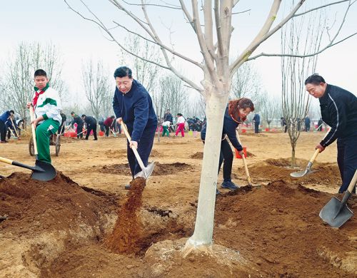 2018年4月2日,黨和國家領導人習近平、李克強、栗戰書、汪洋、王滬寧、趙樂際、韓正、王岐山等來到北京市通州區張家灣鎮參加首都義務植樹活動。這是習近平同大家一起植樹。新華社記者 謝環馳/攝