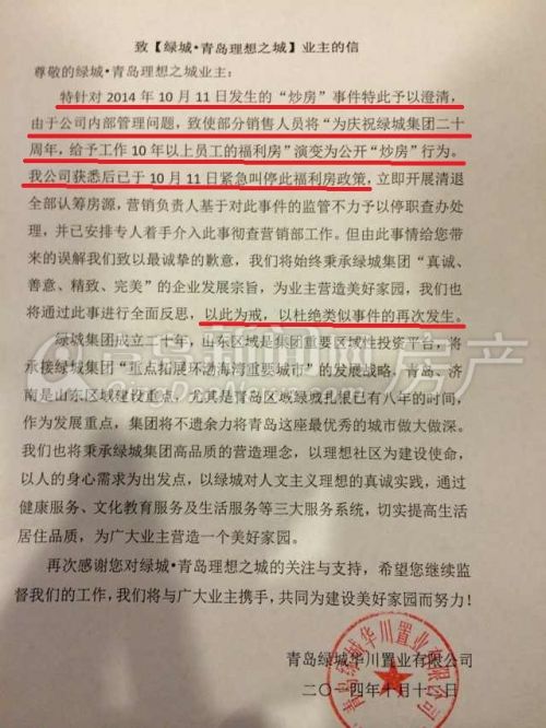 追蹤綠城“降價(jià)”事件,10月12日晚,記者從開發(fā)商青島綠城置業(yè)有限公司了解到,針對綠城老業(yè)主“圍攻”售樓處,集體維權(quán)事件,綠城連夜討論,正式發(fā)布了《致【綠城理想之城】業(yè)主的信》,公開信中明確說明:“特針對2014年10月11日發(fā)生的“炒房”事件特此予以澄清,由于公司內(nèi)部管理問題,致使部分銷售人員將‘為慶祝綠城集團(tuán)二十周年,給予工作10年以上員工的福利房’演變?yōu)楣_‘炒房’行為。我公司獲悉后已于10月11日緊急叫停。并表示‘以此為戒,以杜絕類似事件再次發(fā)生’”。