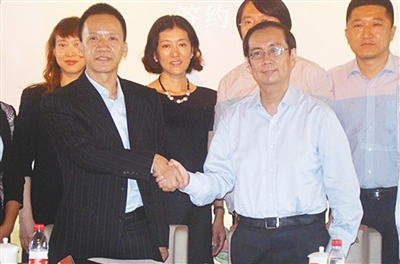 2014年9月25日,石基信息董事長(zhǎng)李仲初(前左)和阿里集團(tuán)首席運(yùn)營(yíng)官?gòu)堄拢ㄇ坝遥┐韮杉夜竞炇稹豆煞菡J(rèn)購(gòu)協(xié)議》。圖片來(lái)源:石基信息公司網(wǎng)站