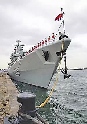 “青島”號(hào)導(dǎo)彈驅(qū)逐艦解纜起航。