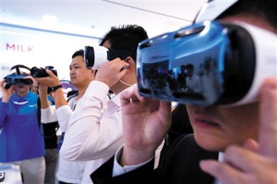 9月24日,觀眾試戴三星虛擬現實設備Gear VR。當天三星在首爾發布Galaxy Note 4、Galaxy Gear智能手表和Gear VR。圖/CFP