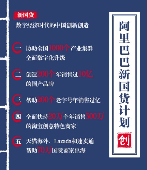 5月8日,阿里巴巴發(fā)布新國貨計劃:協(xié)助全國1000個產(chǎn)業(yè)集群全面數(shù)字化升級;創(chuàng)造200個年銷售過10億的國產(chǎn)品牌; 幫助200個老字號年銷售過億;全面扶持20萬個年銷售500萬的淘寶創(chuàng)意特色商家;天貓海外、Lazada和速賣通幫助70萬國貨商家出海。