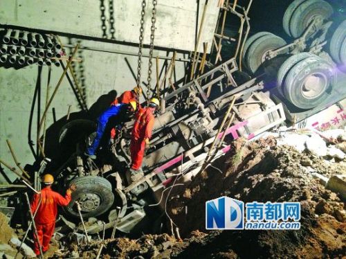 接警后,公安、消防、安監及120急救中心人員迅速趕到現場。救援工作從當晚一直持續至凌晨。救援人員起初派來一輛起重100噸的吊車,“但砂漿車太重了,根本吊不起來。”為了救出被困人員,救援人員開始逐條拆除腳手架的鋼管,再從深坑周圍挖出一條通往駕駛室的臨時通道。之后,再次調派來一輛起重300多噸的吊車,歷經多次嘗試后,砂漿車的車頭終于被吊起。截至昨日凌晨4時30分許,消防官方陸續將劉志安和龍成寬從被困的駕駛室內救出。經過醫生檢查,龍成寬已經當場身亡,劉志安被送往東莞市第五人民醫院接受治療。