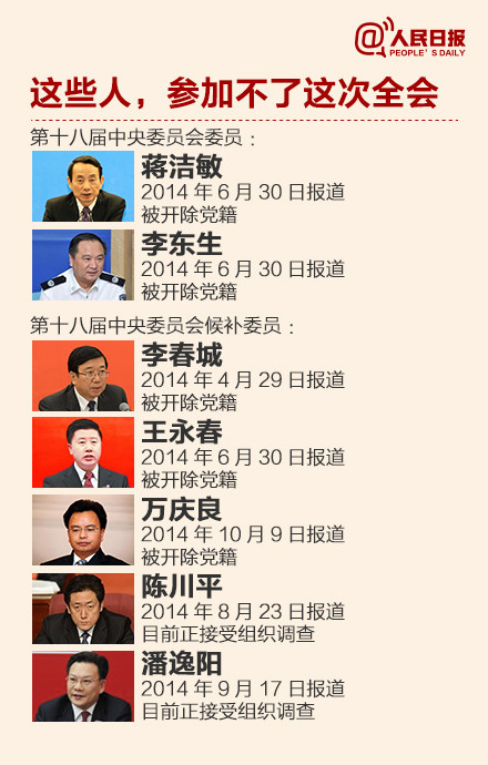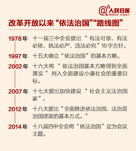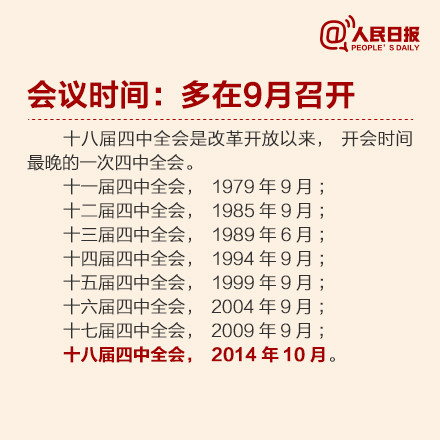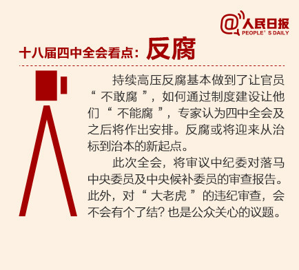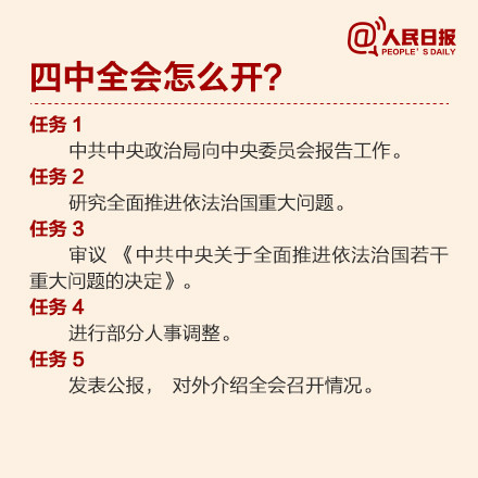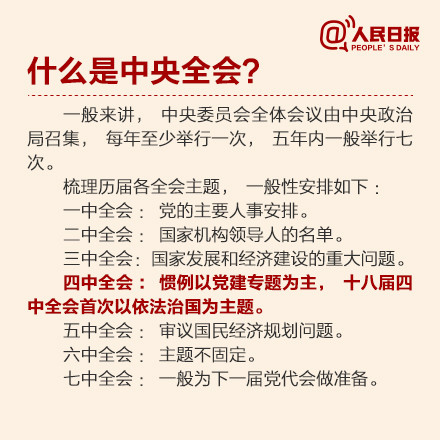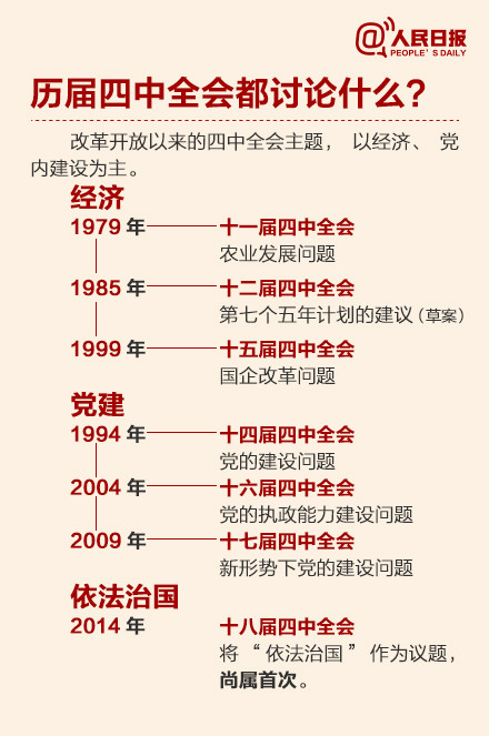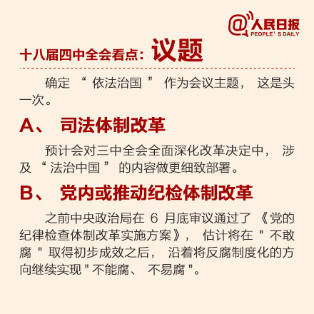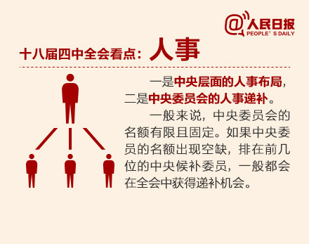 人民網北京10月19日電 人民日報微信公眾帳號今日發表《九張圖,教你讀懂四中全會》的文章,用九張圖清晰地勾勒出本次四中全會的幾大看點:依法治國首次成全會主題、中央層面的人事布局與中央委員會的人事遞補、反腐或將迎來從治標到治本的新起點、“大老虎”的審查或將出結果等等,下面讓我們一起來閱讀。
