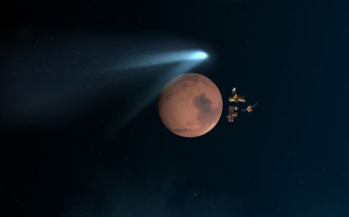 據美國太空網報道,20日凌晨2:27(格林尼治標準時間18:27),賽丁泉彗星(Comet Siding Spring)近距離掠過火星表面,科學家稱之為一次千載難逢的“親密接觸”。彗星掠過火星的壯觀圖像將于數日后發布在美國國家宇航局(NASA)的網站上。