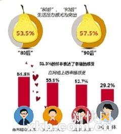 調(diào)查發(fā)現(xiàn),有44.0%的網(wǎng)絡(luò)用戶感受到生活壓力。生活壓力感呈現(xiàn)出年齡越小,壓力感越強(qiáng)的特征。其中,“80后”“90后”生活壓力感尤為突出,有壓力感的分別占到各自群體的53.5%、57.5%。