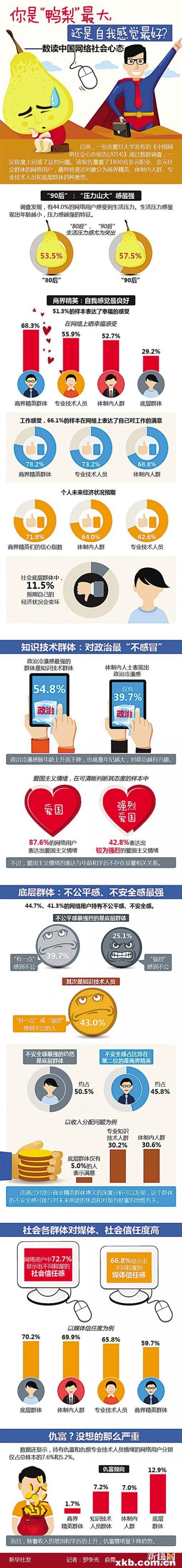 據(jù)新華社電 誰生活壓力感最大?誰感覺最良好?當(dāng)前的社會信任度、媒體信任度到底如何?社會仇富情緒到底有沒有你想的那么嚴(yán)重?日前,一份由復(fù)旦大學(xué)發(fā)布的《中國網(wǎng)絡(luò)社會心態(tài)報告(2014)》通過數(shù)據(jù)調(diào)查,一定程度上回答了這些問題。