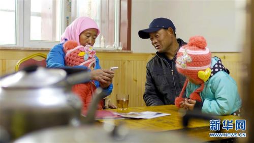 在青海省海東市互助土族自治縣五十鎮(zhèn)班彥村的易地扶貧搬遷新村,村民呂有金(右二)和老伴在新家里照顧孫女(2016年12月25日攝)。新華社記者王大千攝