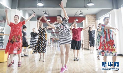 居民們?cè)诤笔∥錆h市青山區(qū)棚改安置小區(qū)青和居社區(qū)活動(dòng)中心練舞(7月30日攝)。新華社記者程敏攝