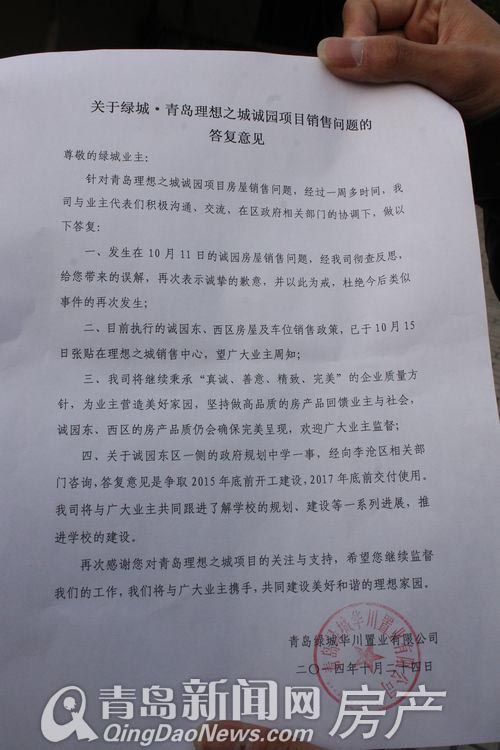 1個小時之后會談結束,業主代表出們宣布會談結果:針對于業主關心的學校問題,政府方面表示綠城單方面宣傳的原定于15年招生的育才中學是“不存在”的。綠城則給予了比較模糊的回答,綠城表示綠城方面經向李滄區政府咨詢之后,綠城誠園中學的規劃建設方面將爭取15年年底開工建設,17年年底前交付使用,但對于后期是哪所學校并未給予說明。