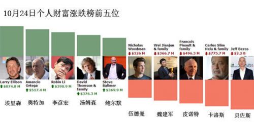 10月24日,財富增長最大的是拉里·埃里森,當(dāng)日上漲8.75億美元。其次是奧特加,當(dāng)日財富上漲5.17億美元。李彥宏的財富增長排在第三位,當(dāng)日上漲3.99億美元。湯森路透集團(tuán)(Thomson Reuters)董事長大衛(wèi)·湯姆森財富上漲3.76億美元,排在第四位。微軟公司前首席執(zhí)行官兼總裁史蒂夫·鮑爾默財富上漲3.7億美元,排在第五位。
