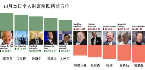 10月22日,財富增長最多的是陸遜梯卡集團(tuán)創(chuàng)始人萊昂納多·戴爾·維吉奧,當(dāng)日上漲7.27億美元。馬化騰的財富增長排在第二位,上漲5.14億美元。排在第三位的是俄羅斯諾爾里斯克鎳礦公司董事長弗拉基米爾·波塔寧,當(dāng)日財富上漲3.84億美元。軟銀集團(tuán)董事長孫正義財富上漲3.74億美元,排在第四位。印度信誠工業(yè)集團(tuán)主席穆克什·安巴尼財富上漲3.59億美元,排在第五位。