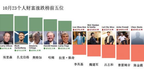 據(jù)福布斯數(shù)據(jù)顯示 ,10月23日,財富增長最大的是拉里·埃里森,當(dāng)日上漲7.42億美元。排在其后的是扎克伯格,財富上漲7.12億美元。排在第三的是西班牙首富阿曼西奧·奧特加,當(dāng)日個人財富上漲5.91億美元。美國巨富、石油大王哈羅德·哈姆當(dāng)日財富上漲5.22億美元,排在第四位。Google創(chuàng)始人拉里·佩奇的個人財富上漲5.16億美元,排在第五位。