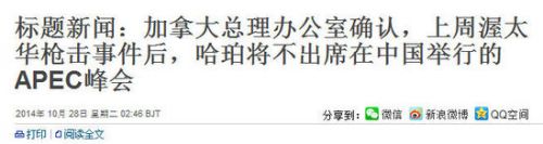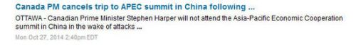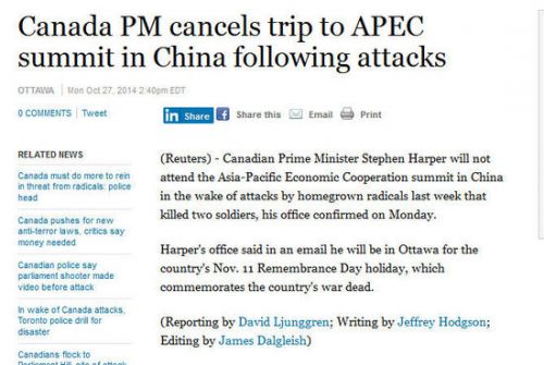 北京時間28日凌晨,加拿大總理史蒂芬-哈珀的發(fā)言人稱,因為10月22日發(fā)生的加拿大議會大樓槍擊案,總理哈珀決定取消出席11月在北京舉行的APEC峰會。