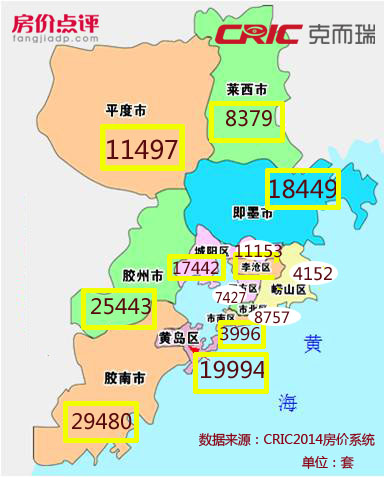 從區域來看,目前庫存量前三的區域分別是原膠南市29480套、膠州市25443套和老黃島19994套,庫存量最少的三個區分別是市南區3996套,嶗山區4152套和老四方7427套。