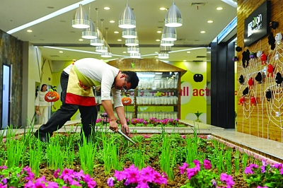 “農(nóng)場”吸引來不少市民看新鮮。餐廳還推出了認(rèn)養(yǎng)服務(wù),就餐的客人可以認(rèn)養(yǎng)“農(nóng)田”里的作物,插上一塊小牌子就算認(rèn)養(yǎng)了,時不時的來看一看自己的作物也非常有趣。不少市民表示,能夠在鬧市區(qū)有這樣一片潔凈的“農(nóng)場”別有一番風(fēng)情。