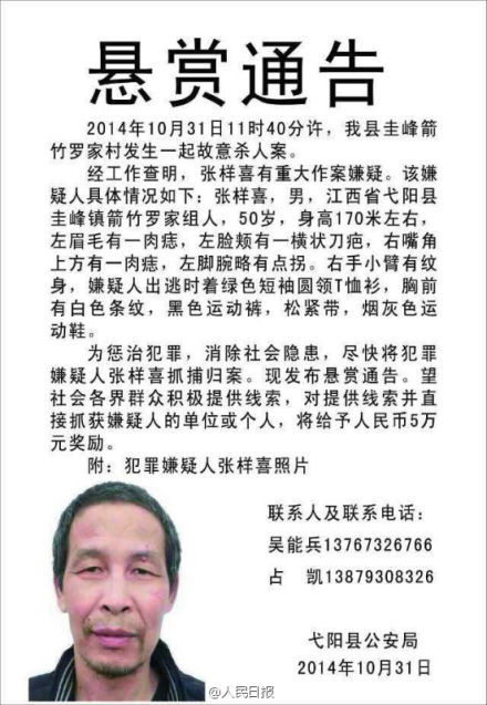 人民日?qǐng)?bào)【他砍死了2名小學(xué)生 看見請(qǐng)報(bào)警】昨天,江西弋陽(yáng)圭峰鎮(zhèn)羅家小學(xué)3名小學(xué)生放學(xué)路上遭砍殺,2人死亡。經(jīng)查,張樣喜有重大嫌疑,50歲,身高170cm左右,左眉毛和右嘴角上方有一顆肉痣,出逃時(shí)穿綠色T恤衫。警方現(xiàn)懸賞5萬元緝兇。如有線索,請(qǐng)聯(lián)系吳能兵13767326766。