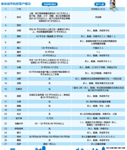 從各地最新的落戶政策看,對購房面積或金額要求最低的是中部城市鄭州——所購房屋建筑面積不小于56平方米即可以遷入兩人戶口;緊隨其后的是西寧和南京,都要求購房面積不小于60平方米;對購房面積要求最高的是西部城市昆明,主城區及呈貢縣購房120平方米以上才可申請本人、配偶和未成年子女落戶。