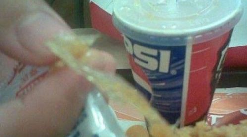 近日,有網(wǎng)友發(fā)貼爆料說去吃KFC竟然吃出了一個避孕套。網(wǎng)友稱:早上起床去吃點東西,當時點了嫩牛五方套餐、雞翅、漢堡……還有兩杯喝的。吃到一半,突然發(fā)現(xiàn)香辣雞翅大異往常,仔細一看,雞翅的面包屑下面,竟然有一個極富韌性的塑料薄膜,拉出來一看——是個避孕套!!!!!!!!!真惡心,叫來服務員,服務員不冷不熱的說了句:“那我給你換一對了!”