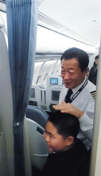 11月10日晚,飛機備降后,機長賀中平微笑著摸著一位男孩的頭。網友供圖