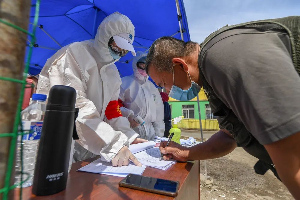 5月11日,在吉林省舒蘭市一小區,進出居民在登記體溫等信息。新華社發