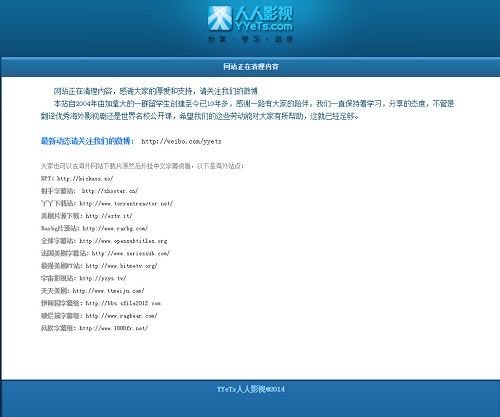 人人影視公告稱,“網(wǎng)站正在清理內(nèi)容,感謝大家的厚愛和支持,請關(guān)注我們的微博本站自2004年由加拿大的一群留學生創(chuàng)建至今已7年多,感謝一路有大家的陪伴,我們一直保持著學習,分享的態(tài)度,不管是翻譯優(yōu)秀海外影視劇還是世界名校公開課,希望我們的這些勞動能對大家有所幫助,這就已經(jīng)足夠。”