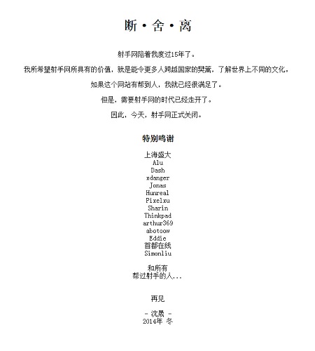 同日,以電影中文字幕為主的主題資訊交換平臺射手網(wǎng)宣布關(guān)閉,站長沈晟在公告中稱“我所希望射手網(wǎng)所具有的價值,就是能令更多人跨越國家的樊籬,了解世界上不同的文化。如果這個網(wǎng)站有幫到人,我就已經(jīng)很滿足了。但是,需要射手網(wǎng)的時代已經(jīng)走開了。因此,今天,射手網(wǎng)正式關(guān)閉。”