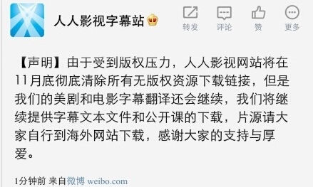 有分析認為,人人影視這次關(guān)站可能和版權(quán)問題有關(guān)。上月底,人人影視字幕站官方微博曾表示,由于受到版權(quán)壓力,人人影視網(wǎng)站將在11月底徹底清除所有無版權(quán)資源下載鏈接。隨后該微博很快被刪。(上圖)