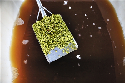 豆芽車間內,紅褐色的水里泡著用于發芽的綠豆。