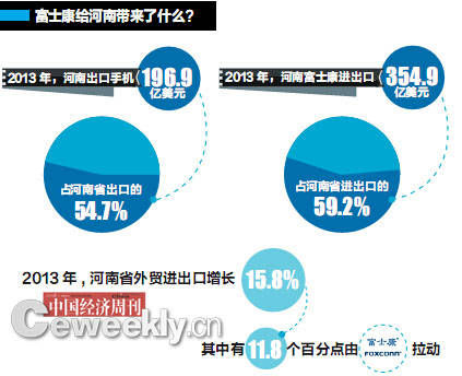 鄭州海關的數據顯示,2013年,富士康出口手機196.9億美元,增長26.4%,占河南省出口的54.7%。同期,富士康集團下轄企業進出口354.9億美元,增長20.7%,占該省進出口的59.2%,其中進口154.2億美元,占該省進口的64.4%;出口200.7億美元,占全省出口的55.8%。富士康進出口貿易對該省外貿的貢獻率為74.2%。2013年,該省外貿進出口增長15.8%,其中有11.8個百分點由富士康拉動。