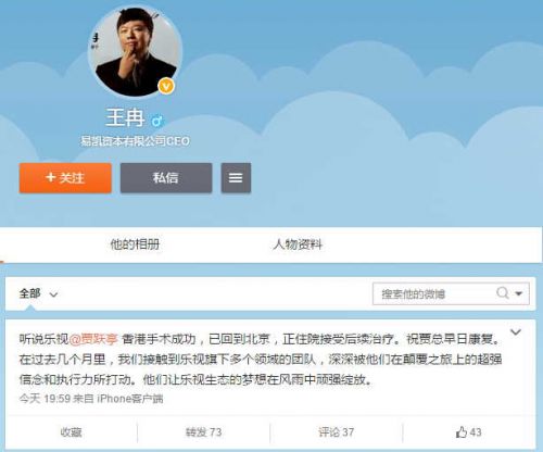 易凱資本有限公司CEO王冉、《中國企業家》等官方認證賬號發布微博稱,賈躍亭手術成功已經返回大陸,還需住院接受進一步治療。